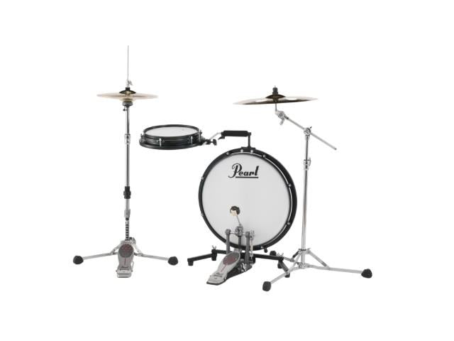 Pearl’s Compact Traveler includes a slim 18” bass drum and 10” snare mounted off a 3/8” post. The compact footprint is perfect for schools, street drummers and small stages.