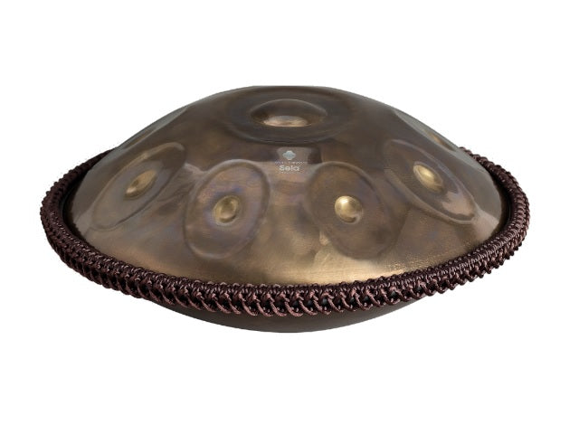Our Journey Handpans are more compact and travel-friendly versions of our high-quality Majesty Handpans. They are also made from the highest quality stainless steel and are completely handmade and intricately tuned by some of the best handpan makers in the world. They sound even better than our popular Harmony Stainless Steel models. Stainless steel handpans have a much longer sustain than nitrided handpans and are therefore particularly suitable for slow, relaxing and meditative playing. At the same time, they are very easy to clean. Sela Journey Stainless Steel handpans have a shiny, bronze-coloured finish, which provides a very noble, high-quality and at the same time mysterious look. Each model in the Journey series also comes with a hand-knotted handpan rope. The decorative ribbon protects the edge of the handpan and also gives it an individual look.